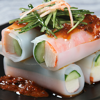 Practice:Cucumber slices, crab stick half-cut, with powder wrapped around the cucumber and crab willow, steamed and dripped with hot sauce.