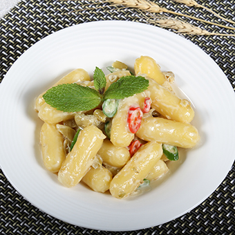 芝士年糕焯熟,青紅尖椒切椒圈,淋上千島醬攪拌均勻即可。