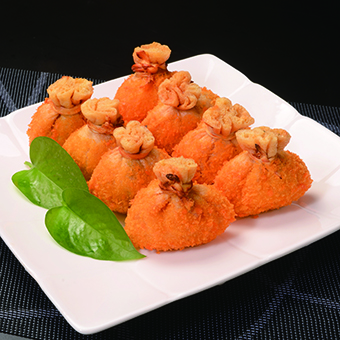 魚籽福袋解凍后裹上面包糠,放入熱油中炸至金黃即可。